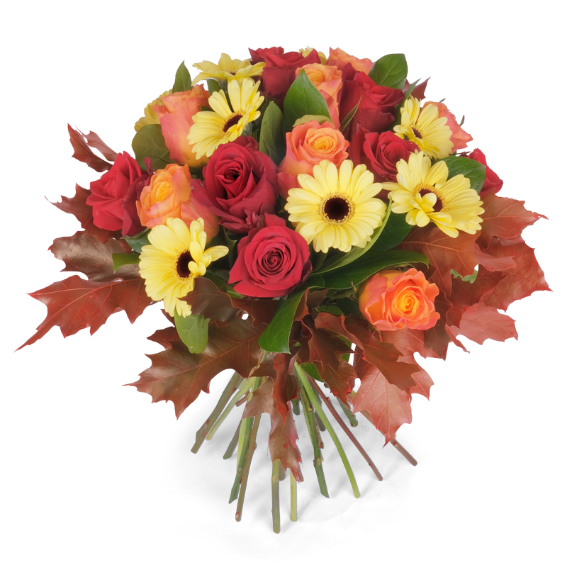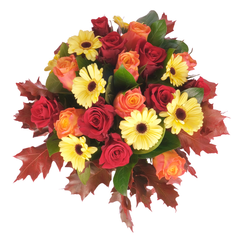 Bukiet „Obfita Jesień” to propozycja dla osób ceniących elegancję i prostotę. Róże i gerbery otoczone liśćmi klonu prezentują się wyjątkowo. To kwiaty, które wprowadzają ciepło i spokój. Doskonałe na prezent lub dekorację. Bukiet, który zawsze robi dobre wrażenie!